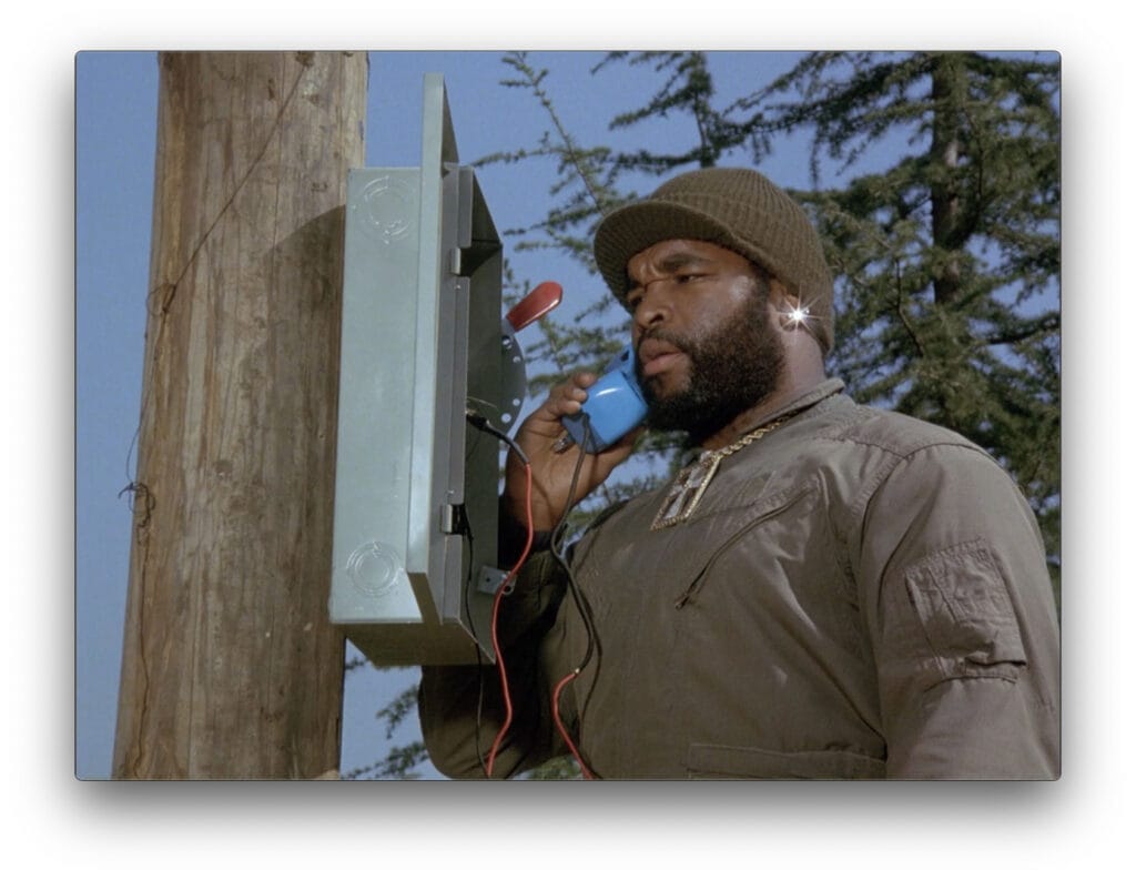 Murdock hides in the back of a van belonging to a nice lady veterinarian. Homer her dog trusts him, so she trusts him–I liked the idea that a veterinarian would trust the instincts of her pets. And I’m sure Homer and Billy get along fine, too. Meanwhile, the rest of the team already has a leg up on the bad guys, having tapped a phone line. Face is tasked with linking that phone number to an address, and I couldn’t help but think how handy Amy’s computer would have been. I’ve read computers can be used to research things.