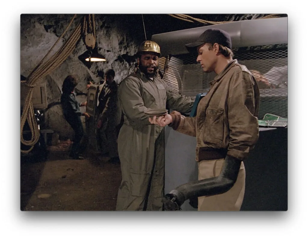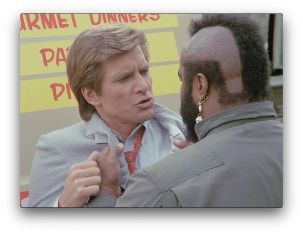 To find the Duke, Murdock starts with “What would Faceman do?” and one fairly-well run scam later (Educational Mandate Time: CRT picture tubes like the one used in the scam actually can emit low-level X-rays, as Murdock implies) and we have our first piece of the puzzle. I really enjoyed his comedic delivery when selling the plan to B.A., with the slightest hint of the kind of mannerism I’d associate with Hardy explaining to Laurel how well a plan is going to work out before it inevitably doesn’t (specifically, that little open-handed flick to B.A.’s chest).