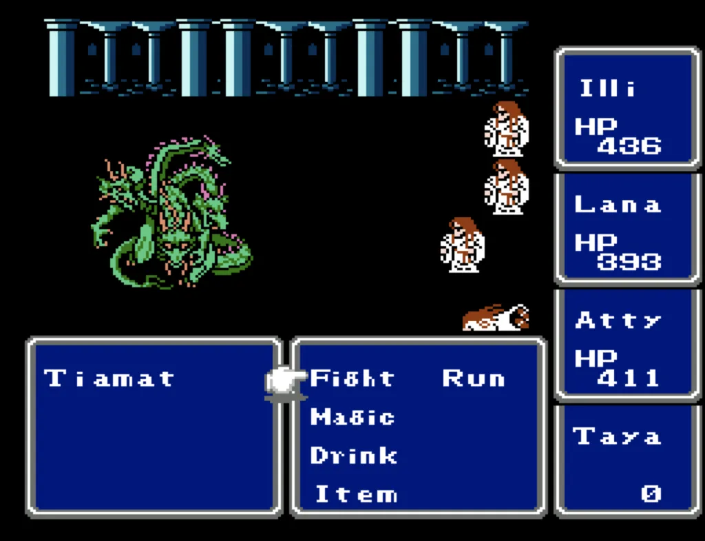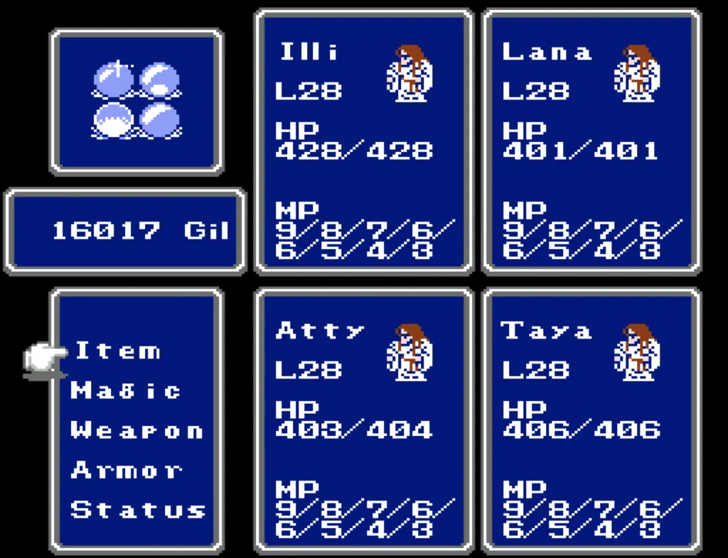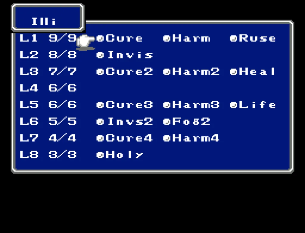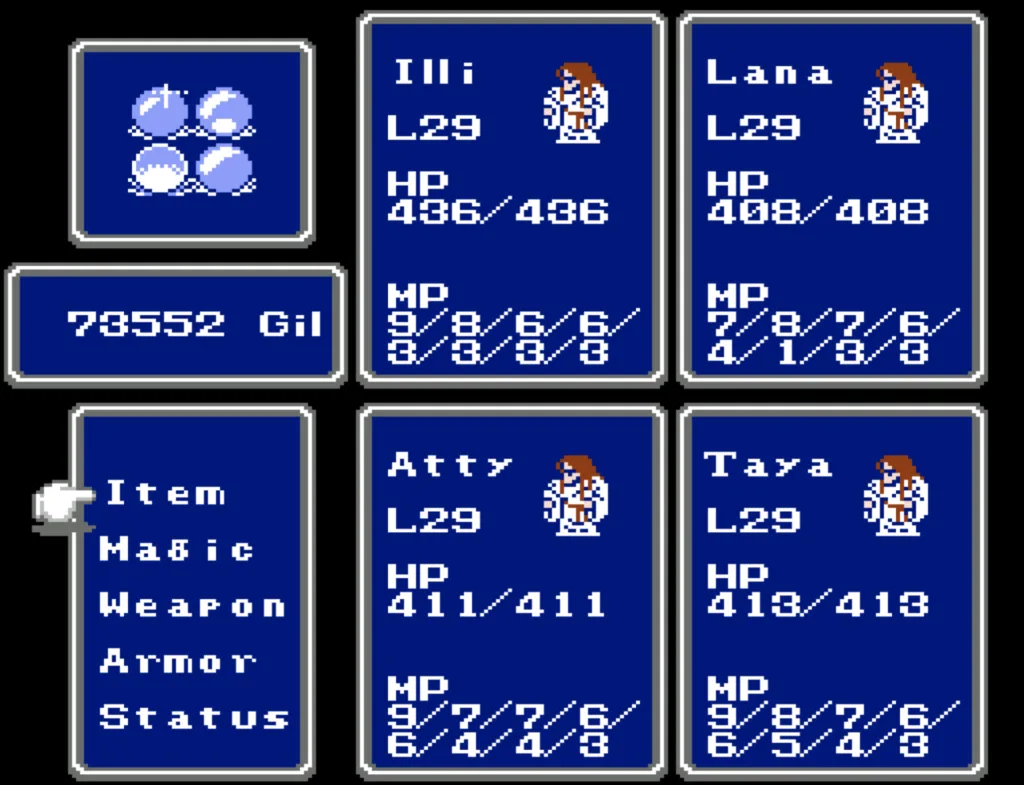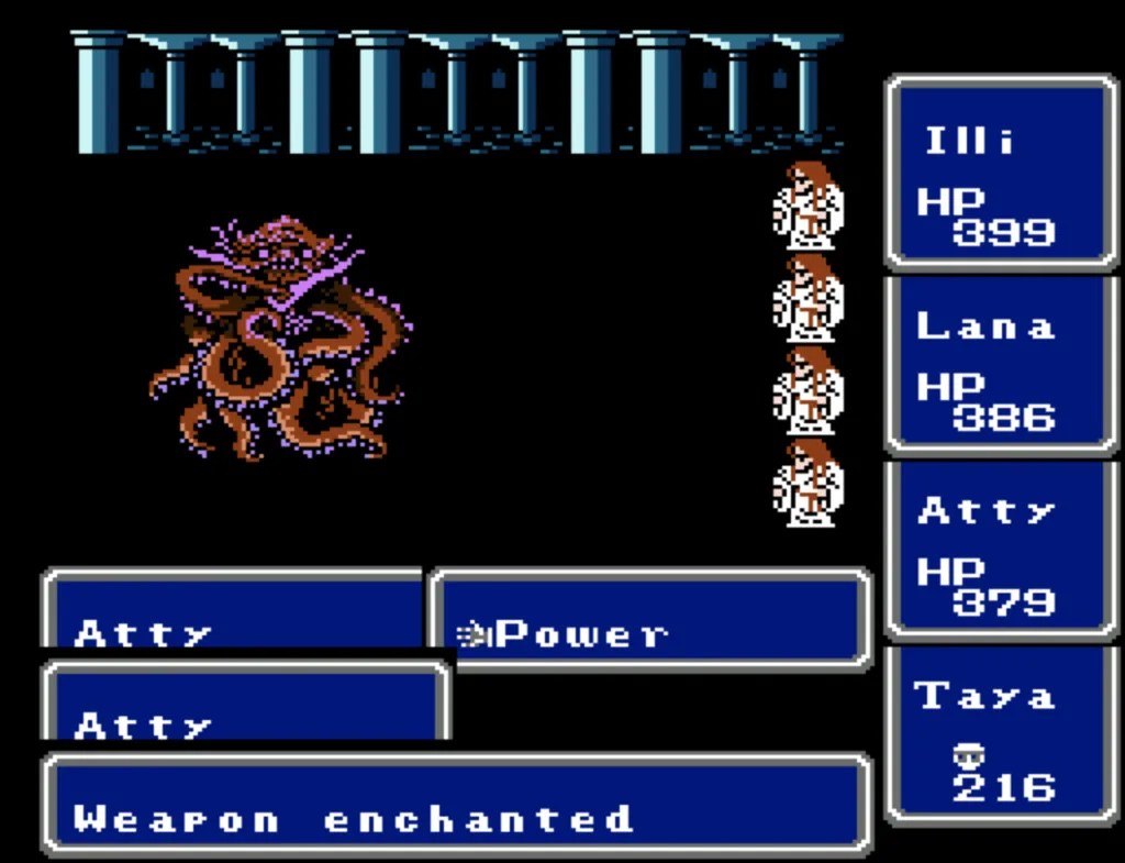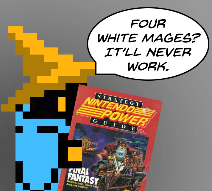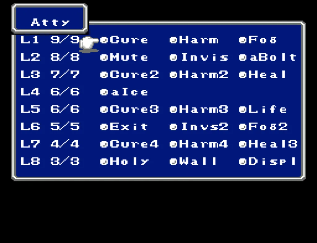 I’ve played through Final Fantasy several times before, but I’d never attempted the ultimate challenge of beating it with four White Mages. And since I needed to beta test a new ROM Hack I’d been working on, this seemed like a good opportunity to accomplish both. Prior to this run, my usual party was Fighter, something (usually another Fighter), White Mage, Black Mage. The first fighter was my Tank and Damage Dealer, the second fighter was his backup, and the Mages did their thing. This is the first time I’ve actually needed to use some real strategy in this game. Having Four White Mages meant I had to decide their roles for them. The first thing I did was make my 3rd slot my primary Damage Dealer. There’s a big advantage to putting my main offense in a lower slot, as the 3rd and 4th slots take a lot less hits than the 1st and 2nd. It also made sense to me to break up the Tank and Damage roles. I’m actually not sure why I didn’t do this earlier; it’s a sound strategy regardless of your party composition.