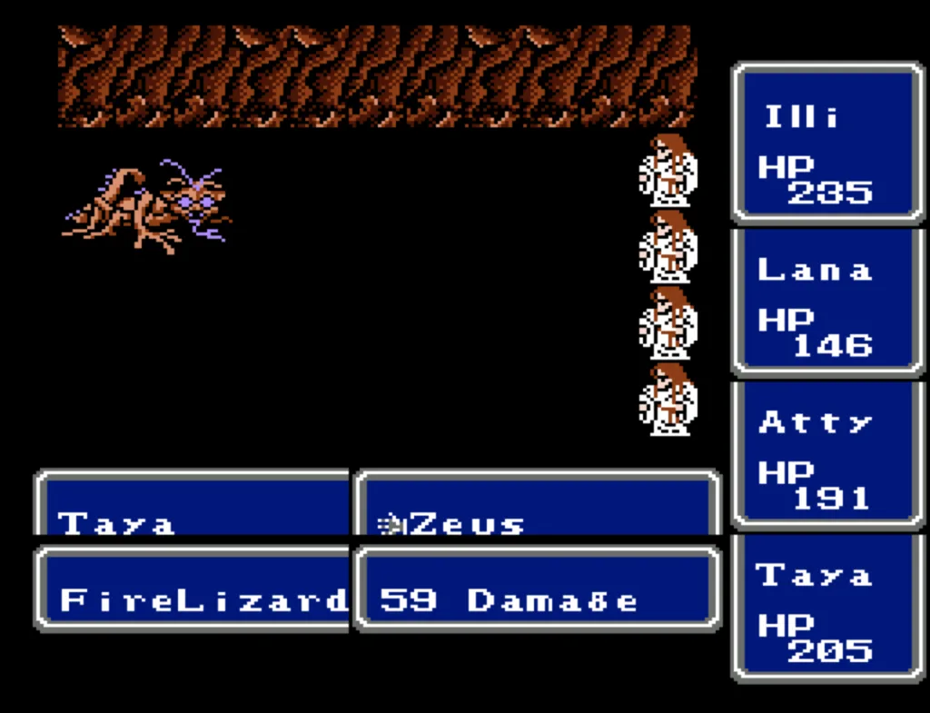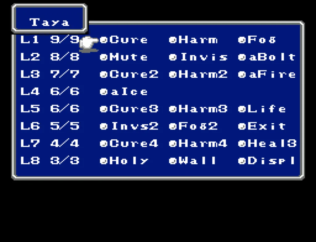 Taya is my primary magical Damage Dealer and clean up. Like Lana and Atty, she carries both damaging and healing items. She carries most of the odd-ball spell casting items like both Robes, the Wizard staff (which casts Confuse), and the Bane sword. She and Atty both have a full compliment of the higher level spells like Wall, Holy, and Dispel. Atty and Taya also both carry a few more specialty spells, most notably Mute. Mute isn’t very useful except versus Astos–where it’s absolutely essential because at that stage in the game, there’s no defense against the instant-death Rub spell. But as it turns out, Mute was useful to us on one other occasion (more on that later).