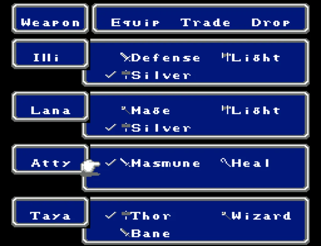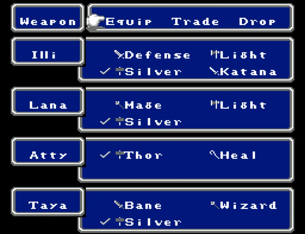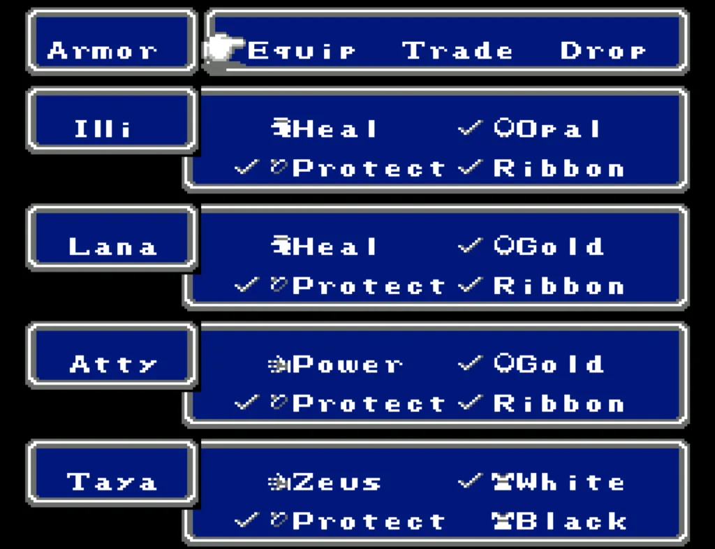 Illi ended up with significantly more HP than the rest, so she serves as my Tank in that first slot. She has the best armor, and is the only one who doesn’t carry a damage-dealing magic item. She has some magic, but not as much as Atty or Taya. She also carries the Defense sword so she can Ruse herself, making her even harder to hit.