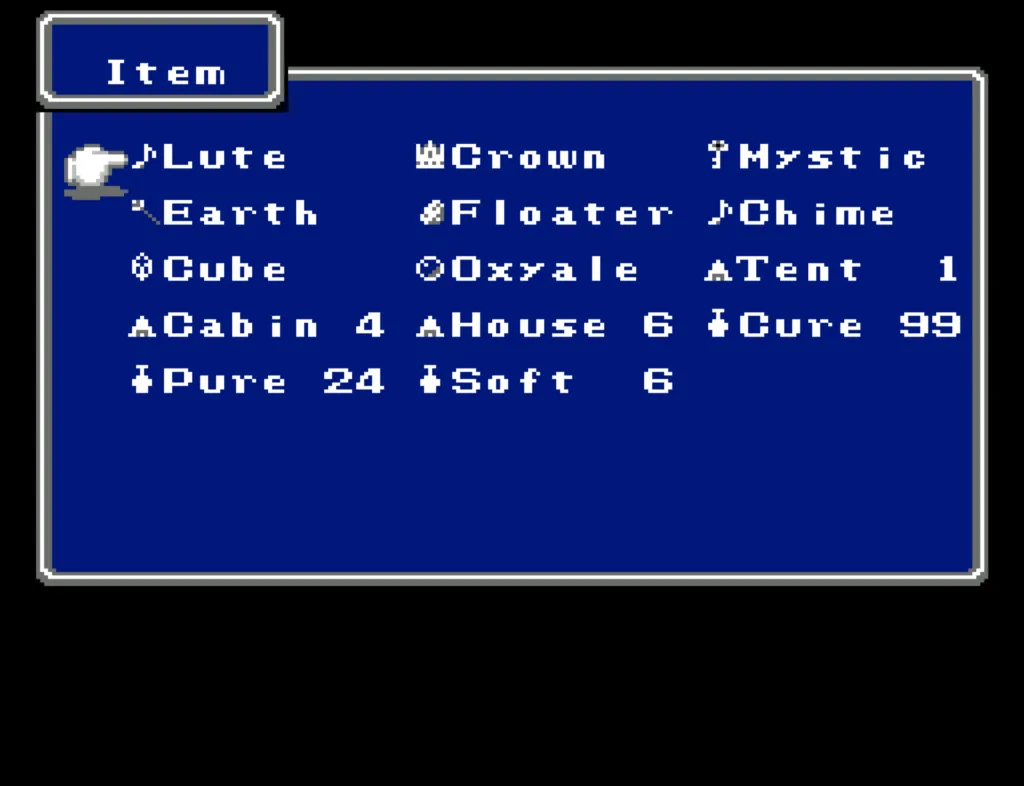 Together, I have a party with a well-defended tank in the first slot, 3 healers in the first 3 slots (with the 4th carrying the White Robe–which doesn’t heal, but is very effective for defense, raising the evade of the whole party), and 3 damage dealers in the last 3 slots. The beauty of this is all of those roles are accomplished without even taking proper spells into account–they’re all granted via magical items. And magic items can be used indefinitely. Versus bosses, I whip out the real magic, but most fights actually require only the items to both do damage and keep HP up. This means running out of spells was a rare problem for this party, at least once we reached the mid-game.