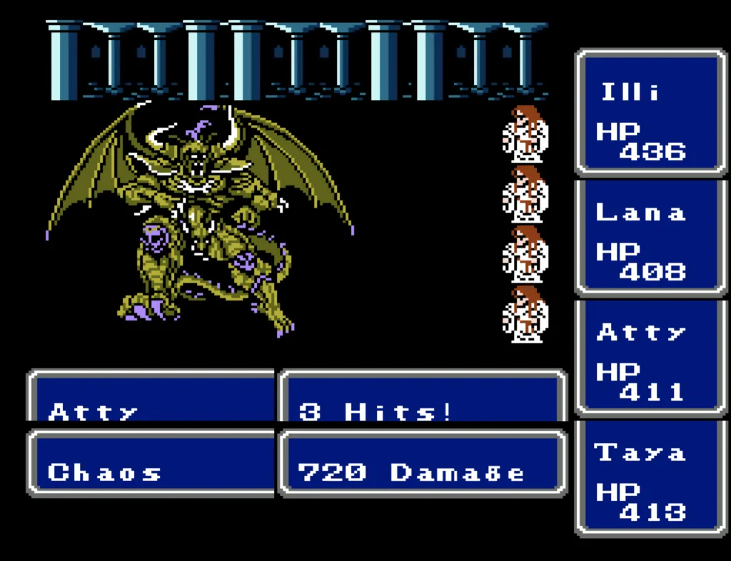 Chaos required some strategy. Being fully aware that he could cast Cure 4 and nullify any damage we did, we didn’t waste any of the big spells on him. Illi and Lana spent the first few rounds casting Invis 2, as did Taya with the White Robe; meanwhile, Atty milked the Power Gauntlet for all it was worth.