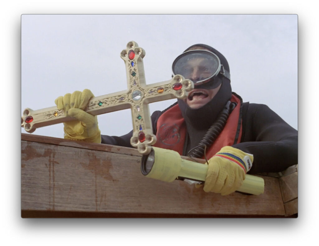 Murdock, what be a man what carries many talents, scuba dives down the dark fathoms and retrieves a most fine piece o’ booty, a cross made o’ pure gold and encrusted with jewels. But whom should be awaitin’ our hero when he climbs back aboard? (I’ll give ye a hint: they be folk what be sayin’ “Arrrr!” a lot).