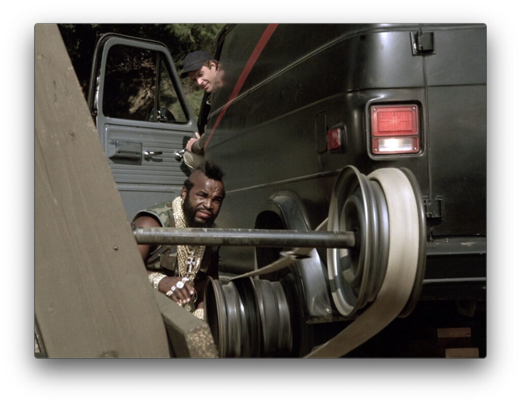 Finally, this is not the first time we’ve seen it, but it’s the first time I’ve highlighted another running theme, where Hannibal will ask the team if they remember the time they did that thing in that place? The others will recall it, smile knowingly, B.A. will say “Yeahhhh!” and then everyone gets to work on the tank. Anyway, the bad guys show up on cue, the tank works, they get soaked, and blackmailed (via arson photos) into leaving town. Not as satisfying an ending as most, but I shouldn’t complain–the real justice was delivered when B.A. shot up the bad guy’s place in recompense for the damage done to his Van earlier.