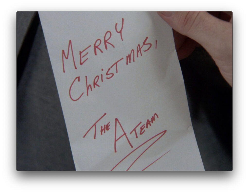 There’s an odd twist on the Face does Accounting routine–I wasn’t sure what to expect when Hannibal asked Face to pay the bad guys what we own them. First off, he didn’t whip out his notepad and instead went to the cash register. The grenade was a great gag and I love that they took the time to wrap it in a paper bag and put it in the cash register.