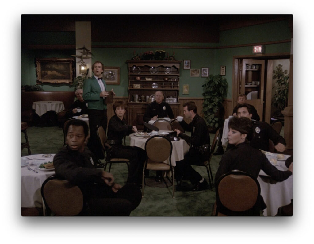 Round 4: is delivered very quickly. The bad guys arrive in force at the restaurant–right in the middle of a meal our heroes hosted in honor of L.A.’s finest. They’re promptly chased out.