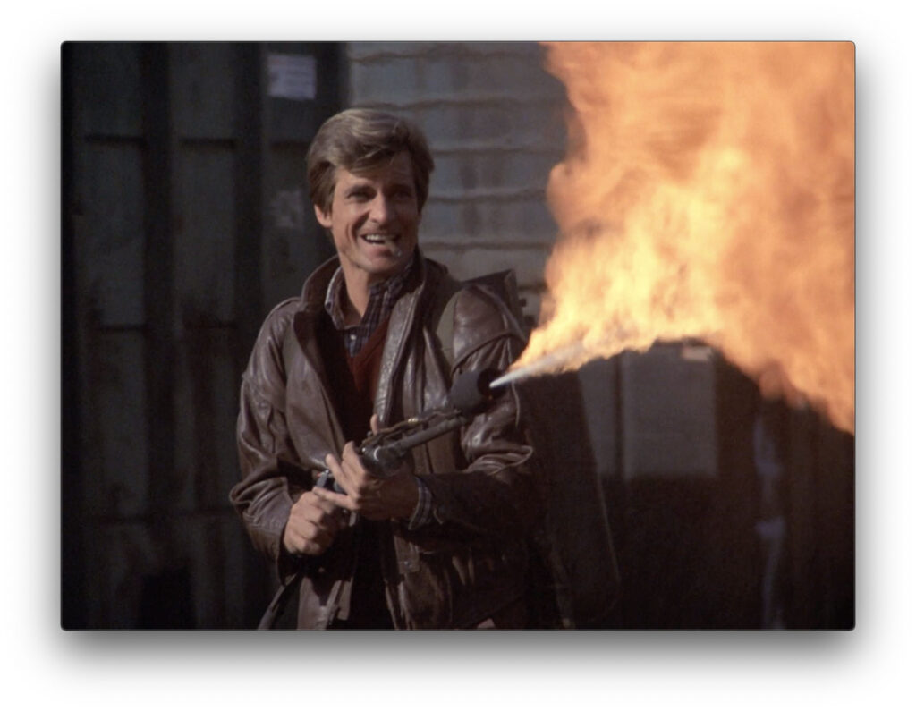 We make our way up the ladder to the head bad guy, who happily signs a confession that he’s been illegally dumping toxic waste (where “happily” means “grudingly and at gun-point and with a pool of toxic sludge slowly creeping across his desk toward him”) (oh, and where “toxic sludge” means “maple syrup”). Meanwhile, the henchmen figure out the dart and capture the clients, setting up the final confrontation. We don’t exactly have a tank this ep, but I’m going to give it a pass ’cause they build from scratch a pretty sweet flame thrower for Face (again, they even took the time to paint it because presentation counts).