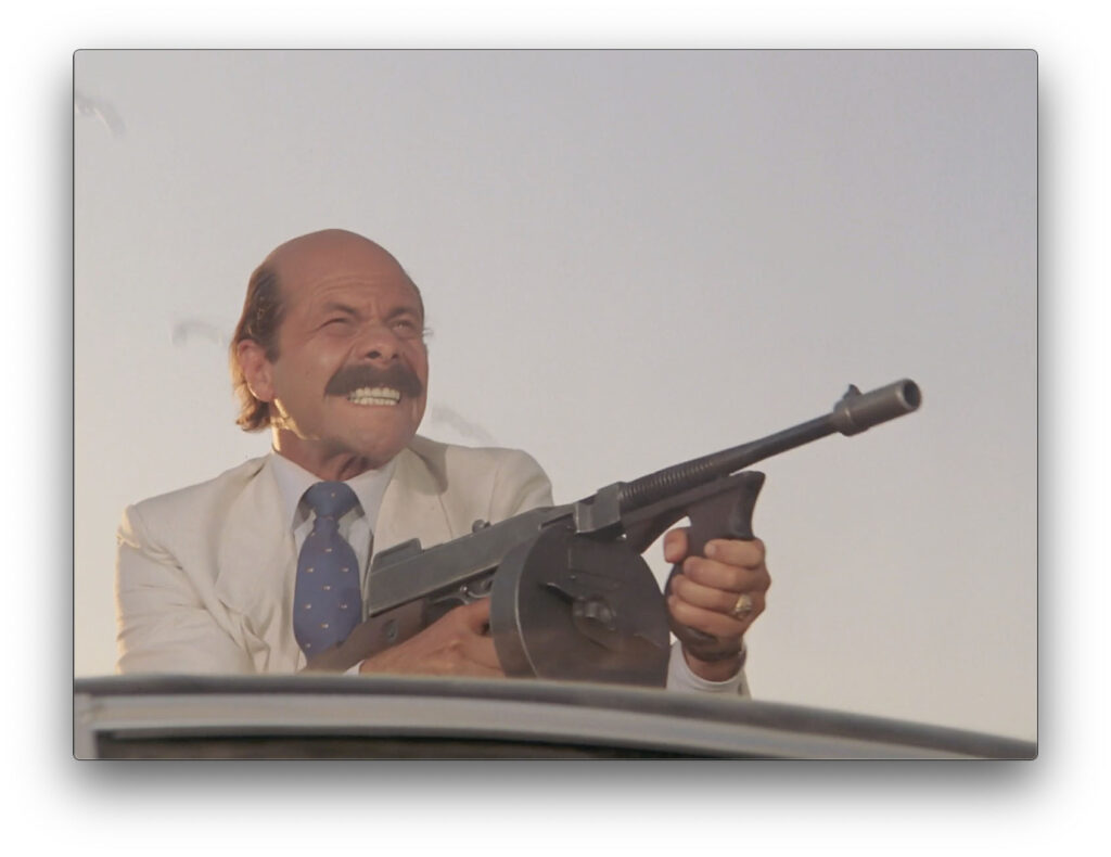 Hannibal is eventually busted and ends up… well beating up himself, just before being captured by feisty Marta at the point of a shotgun. It doesn’t take long for him to begin turning them all against eachother, which buys him just enough time for the rest of the team to show up in The Tank. Followed by the MPs. Followed by Airwolf. The team escapes, exploding two MP cars out of their way (I’m going to go ahead and count those as flips), but Airwolf manages to spirit the girl away. Some mandolin music teases us into the second half of our two-parter as the bad guy’s brother comes in from the Old Country to set things straight.