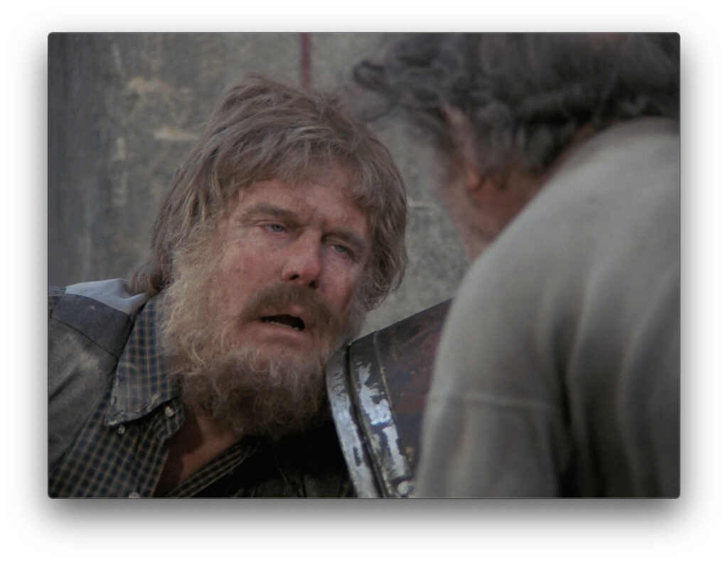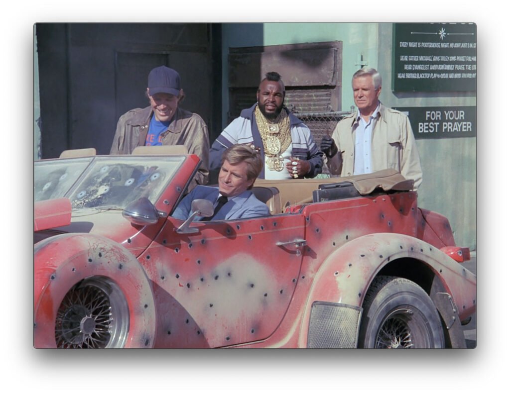 Nah, forget all that. We don’t yet know why they’re capturing bums, though even Hannibal acknowleges waking up from his chloroforming to find himself “in a sci fi movie.” What we do know is Face is driving quite the car. An Excalibur (I had to google it). Wonder if it’ll survive the ep? My money is somewhere between Amy’s wreck and leaded swiss cheese. But back to the current act: the bum who’s not Hannibal is handed a large suitcase of money just before being captured by the MPs. Our heroes spring him (as is their norm in such situations), only to discover the mix-up.