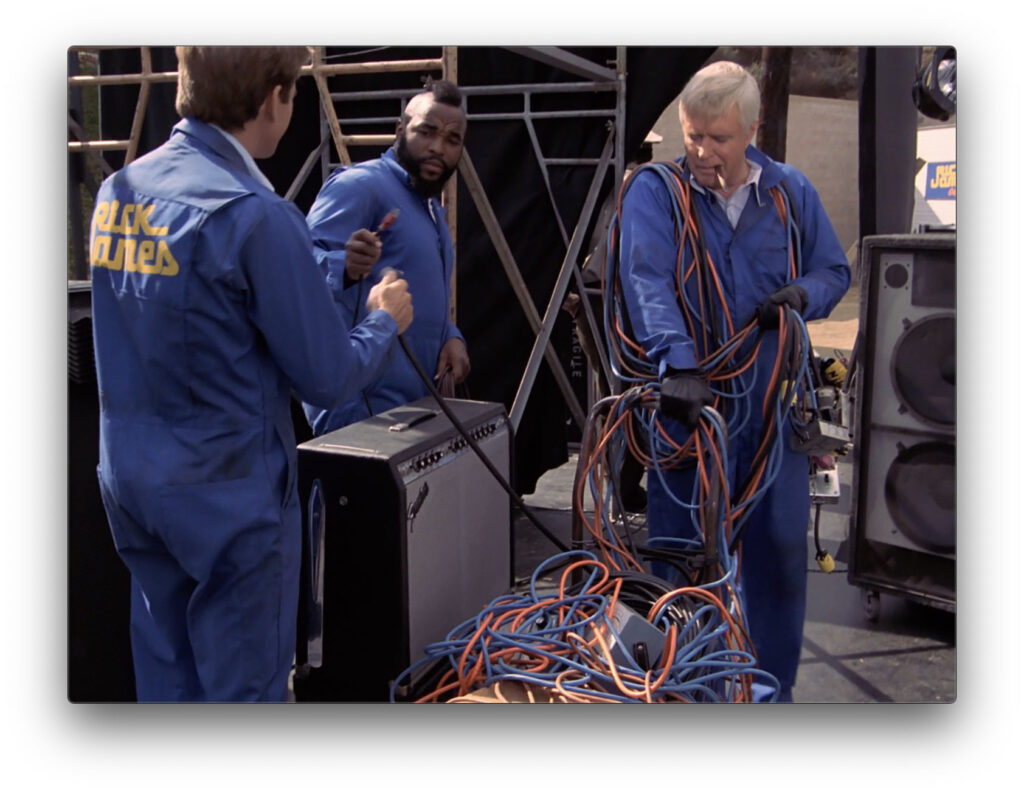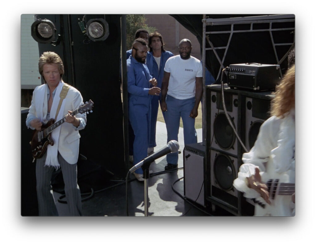 We open with a minute montage of L.A. set to Huey Lewis’ The Heart of Rock ‘n’ Roll (incidentally the title of this ep). We then move into three more minutes of stock footage of Rick James in concert–whom I admit I actually know nothing about. Except that I’m pretty sure he’s not Huey Lewis. During the concert, Hannibal scores a free guitar thrown off the stage–sweet, free guitar!