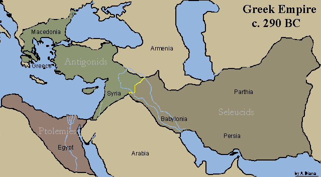 - c. 290 - It does not take long for Alexander's empire to disolve into three smaller empires: the Ptolemies in Egypt, the Antigonids in Macedonia and Greece, and the Seleucids from Babylon eastward.